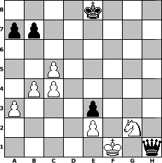 Partie-Notation im PGN-Format [Event "Chess960 im M"] [Site "www.mySchach.de"] [Date "2010.02.28"] [Round "1"] [White "Schefsche"] [Black "sterpfi"] [Variant "Fischerrandom"] [SetUp "1"] [FEN "nqbrkbnr/pppppppp/8/8/8/8/PPPPPPPP/NQBRKBNR w KQkq - 0 1"] [WhitemyELO "1409"] [BlackmyELO "1489"] [Result "0-1"] [TimeControl "10/1728000"] [WhiteDays "82"] [BlackDays "64"] [MySchachNr "63635"] 1. g3 e5 2. a3 d5 3. Bh3 Bxh3 4. Nxh3 Qc8 5. Ng5 Be7 6. Nf3 e4 7. Nd4 Qh3 8. d3 Qg2 9. Rf1 Qxh2 10. Be3 c5 11. Nf5 d4 12. Bf4 e3 13. fxe3 g5 14. Nxe7 gxf4 15. Nxg8 Qxg3+ 16. Kd2 Qxe3+ 17. Ke1 Rxg8 18. Qc1 h5 19. Rxf4 Rg1+ 20. Rf1 Rxf1+ 21. Kxf1 Qh3+ 22. Kf2 Qh2+ 23. Ke1 Qg3+ 24. Kd2 Qe3+ 25. Ke1 Rd5 26. Qxe3+ dxe3 27. c4 Rg5 28. Kf1 f5 29. Nc2 f4 30. d4 h4 31. dxc5 h3 32. Rd5 h2 33. Rxg5 h1=Q+ 34. Rg1 Qh3+ 35. Rg2 Nc7 36. Ne1 Ne6 37. b4 f3 38. Nxf3 Nf4 39. Ne1 Nxg2 40. Nxg2 Qh1# 0-1 Stellungs-Notation im FEN-Format 4k3/pp6/8/2P5/1PP5/P3p3/4P1N1/5K1q - - - 1 41 Geschlagene Figuren Weiss: Geschlagene Figuren Schwarz: Klicken Sie auf eine geschlagene Figur um den gewünschten Zug darzustellen!