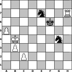 Partie-Notation im PGN-Format [Event "3.Clubmeisterschaft Aljechins Enkel"] [Site "www.mySchach.de"] [Date "2008.03.01"] [Round "1"] [White "Knight"] [Black "Schefsche"] [ECO "D00"] [WhitemyELO "1115"] [BlackmyELO "1435"] [Result "1-0"] [TimeControl "10/3456000"] [WhiteDays "199"] [BlackDays "167"] [MySchachNr "43007"] 1. d4 d5 2. e4 e5 3. dxe5 d4 4. Bc4 Nc6 5. Nf3 Bg4 6. Bxf7+ Kxf7 7. Ng5+ Qxg5 8. Bxg5 Bxd1 9. Kxd1 h6 10. Bf4 Bc5 11. Nd2 Re8 12. Nc4 b5 13. Nd2 g5 14. e6+ Rxe6 15. Bxc7 h5 16. Nf3 Kg6 17. h4 g4 18. Ng5 Rf6 19. f4 gxf3 20. gxf3 Bd6 21. Bxd6 Rxd6 22. a4 b4 23. f4 a5 24. f5+ Kf6 25. e5+ Nxe5 26. Rf1 Ng4 27. Ne4+ Ke5 28. Nxd6 Ne3+ 29. Ke2 Nxf1 30. Nf7+ Kf6 31. Nxh8 Ng3+ 32. Kf3 Nxf5 33. Rg1 Nxh4+ 34. Kf4 Ne7 35. Ke4 Nhf5 36. Kd3 h4 37. b3 h3 38. Kc4 h2 39. Rh1 Kg7 40. Rxh2 Nh6 41. Kxd4 Nef5+ 42. Kc5 Kxh8 43. Kb5 Kg7 44. Kxa5 Kf6 45. Kxb4 Ng4 46. Rh7 Ne7 47. a5 1-0 Stellungs-Notation im FEN-Format 8/4n2R/5k2/P7/1K4n1/1P6/2P5/8 - - - 0 47 Geschlagene Figuren Weiss: Geschlagene Figuren Schwarz: Klicken Sie auf eine geschlagene Figur um den gewünschten Zug darzustellen!