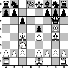 Partie-Notation im PGN-Format [Event "around 1500"] [Site "www.mySchach.de"] [Date "2005.02.03"] [Round "1"] [White "Jonas84"] [Black "rikilatic"] [ECO "C40"] [WhitemyELO "1458"] [BlackmyELO "1573"] [Result "1-0"] [TimeControl "10/864000"] [WhiteDays "05"] [BlackDays "10"] [MySchachNr "10152"] 1. e4 e5 2. Nf3 Qf6 3. Nc3 c6 4. d4 exd4 5. Bg5 Qg6 6. Qxd4 d6 7. Bc4 Bg4 8. Ne5 dxe5 9. Qd8# 1-0 Stellungs-Notation im FEN-Format rn1Qkbnr/pp3ppp/2p3q1/4p1B1/2B1P1b1/2N5/PPP1PPPP/R3K2R - KQkq - 1 9 Geschlagene Figuren Weiss: Geschlagene Figuren Schwarz: Klicken Sie auf eine geschlagene Figur um den gewünschten Zug darzustellen!
