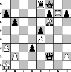 Partie-Notation im PGN-Format [Event "Spa"] [Site "www.mySchach.de"] [Date "2009.09.15"] [Round "1"] [White "Master1"] [Black "Steppenwolf"] [ECO "E20"] [WhitemyELO "1294"] [BlackmyELO "1152"] [Result "0-1"] [TimeControl "10/2592000"] [WhiteDays "20"] [BlackDays "26"] [MySchachNr "59050"] 1. d4 Nf6 2. c4 e6 3. Nc3 Bb4 4. Bd2 b6 5. a3 Bxc3 6. Bxc3 Bb7 7. e3 c5 8. Bd3 Bxg2 9. f3 Bxh1 10. Qe2 O-O 11. O-O-O Nc6 12. e4 Re8 13. Nh3 cxd4 14. Bd2 Bxf3 15. Qxf3 d5 16. Bg5 dxc4 17. Bxc4 Ne5 18. Qf1 Nxc4 19. Qxc4 Rc8 20. Qxc8 Qxc8+ 21. Kb1 e5 22. Nf2 Qc4 23. Rg1 d3 24. Bxf6 Qc2+ 25. Ka1 Qxf2 26. Rxg7+ Kf8 0-1 Stellungs-Notation im FEN-Format 4rk2/p4pRp/1p3B2/4p3/4P3/P2p4/1P3q1P/K7 - - - 1 27 Geschlagene Figuren Weiss: Geschlagene Figuren Schwarz: Klicken Sie auf eine geschlagene Figur um den gewünschten Zug darzustellen!