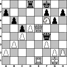 Partie-Notation im PGN-Format [Event "Schachturnier Eins"] [Site "www.mySchach.de"] [Date "2015.11.01"] [Round "1"] [White "FrankB"] [Black "miu"] [ECO "A48"] [WhitemyELO "1677"] [BlackmyELO "1621"] [Result "1-0"] [TimeControl "10/1728000"] [WhiteDays "20"] [BlackDays "20"] [MySchachNr "101067"] 1. d4 Nf6 2. Nf3 g6 3. e3 Bg7 4. c4 O-O 5. Nc3 d6 6. Bd3 Nbd7 7. O-O c6 8. Qc2 e5 9. Rd1 Qc7 10. dxe5 dxe5 11. b3 Nc5 12. Ba3 e4 13. Bxe4 Nfxe4 14. Nxe4 Bf5 15. Bxc5 Rfe8 16. Nfd2 Rad8 17. Bd4 Bxd4 18. exd4 Qe7 19. Re1 Kf8 20. f3 Qc7 21. Qc3 Bxe4 22. Nxe4 b6 23. Nf6 Rxe1+ 24. Rxe1 Qf4 25. d5 c5 26. Qe5 1-0 Stellungs-Notation im FEN-Format 3r1k2/p4p1p/1p3Np1/2pPQ3/2P2q2/1P3P2/P5PP/4R1K1 - - - 1 26 Geschlagene Figuren Weiss: Geschlagene Figuren Schwarz: Klicken Sie auf eine geschlagene Figur um den gewünschten Zug darzustellen!