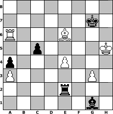 Partie-Notation im PGN-Format [Event "Schach dem Osterhasen XIII"] [Site "www.mySchach.de"] [Date "2025.04.12"] [Round "1"] [White "Grubengeist"] [Black "larlinde"] [ECO "B32"] [WhitemyELO "2111"] [BlackmyELO "2165"] [Result "1/2-1/2"] [TimeControl "10/2592000"] [WhiteDays "145"] [BlackDays "070"] [MySchachNr "133235"] 1. e4 c5 2. Nf3 Nc6 3. d4 cxd4 4. Nxd4 e5 5. Nb5 d6 6. c4 Be6 7. Bd3 g6 8. O-O Nge7 9. N1c3 Bg7 10. Nd5 O-O 11. Be3 a6 12. Bb6 Qd7 13. Nbc7 Rab8 14. Nxe6 fxe6 15. Nxe7+ Qxe7 16. g3 Rf7 17. Kg2 Ra8 18. Rb1 a5 19. Rc1 Qd7 20. Rc3 Raf8 21. Rb3 Kh8 22. Rb5 h5 23. a3 Bh6 24. h4 Kg8 25. Bb1 Rf6 26. Rb3 Qf7 27. Qxd6 Qg7 28. Rd3 g5 29. Qd7 gxh4 30. Qxg7+ Kxg7 31. Rd7+ R8f7 32. Rfd1 hxg3 33. Rxf7+ Rxf7 34. fxg3 Bg5 35. Ba2 a4 36. c5 Nd4 37. c6 bxc6 38. Bxd4 exd4 39. Rxd4 Be3 40. Rd6 c5 41. Ra6 Rf2+ 42. Kh3 Rxb2 43. Bxe6 Bg1 44. Kh4 Re2 45. Kxh5 1/2-1/2 Stellungs-Notation im FEN-Format 8/6k1/R3B3/2p4K/p3P3/P5P1/4r3/6b1 - - - 0 45 Geschlagene Figuren Weiss: Geschlagene Figuren Schwarz: Klicken Sie auf eine geschlagene Figur um den gewünschten Zug darzustellen!