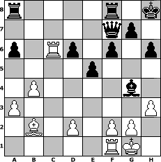Partie-Notation im PGN-Format [Event "Turnier in den M"] [Site "www.mySchach.de"] [Date "2014.02.19"] [Round "1"] [White "hape50"] [Black "Winston"] [ECO "D00"] [WhitemyELO "1284"] [BlackmyELO "1450"] [Result "0-1"] [TimeControl "10/2592000"] [WhiteDays "29"] [BlackDays "30"] [MySchachNr "93078"] 1. d4 d5 2. h3 h6 3. e3 a6 4. Nf3 Nc6 5. a3 Nf6 6. Bd3 e6 7. O-O Bd6 8. Nc3 O-O 9. b4 b5 10. e4 dxe4 11. Nxe4 Nd5 12. Bb2 Kh8 13. Bc1 e5 14. Bb2 f6 15. Nh4 Nce7 16. c4 Nf4 17. d5 Nxd3 18. Qxd3 Bb7 19. Ng3 bxc4 20. Qxc4 Bxd5 21. Qg4 Qe8 22. Ngf5 Nxf5 23. Nxf5 Qf7 24. Rac1 Be6 25. Nxd6 cxd6 26. Rc6 Bxg4 0-1 Stellungs-Notation im FEN-Format r4r1k/5qp1/p1Rp1p1p/4p3/1P4b1/P6P/1B1P1PP1/5RK1 - - - 0 27 Geschlagene Figuren Weiss: Geschlagene Figuren Schwarz: Klicken Sie auf eine geschlagene Figur um den gewünschten Zug darzustellen!