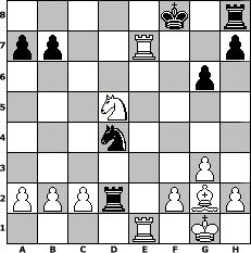 Partie-Notation im PGN-Format [Event "5erD5"] [Site "www.mySchach.de"] [Date "2025.05.05"] [Round "2"] [White "spiderman"] [Black "peter58"] [ECO "A00"] [WhitemyELO "1730"] [BlackmyELO "1557"] [Result "1-0"] [TimeControl "10/3456000"] [WhiteDays "081"] [BlackDays "110"] [MySchachNr "133294"] 1. g3 d5 2. d4 Nf6 3. Nf3 Nc6 4. Nc3 g6 5. Bg2 e6 6. O-O Bg7 7. Bf4 Nh5 8. Bg5 Bf6 9. Bh6 Bg7 10. Bxg7 Nxg7 11. e4 dxe4 12. Nxe4 f6 13. d5 exd5 14. Qxd5 Be6 15. Qxd8+ Rxd8 16. Nxf6+ Kf7 17. Ne4 Bc4 18. Neg5+ Ke7 19. Rfe1+ Kf6 20. Ne4+ Kf7 21. Nc5 Ne6 22. Nxe6 Bxe6 23. Ng5+ Kf6 24. Nxe6 Rd2 25. Nxc7 Nd4 26. Nd5+ Kg7 27. Re7+ Kf8 28. Rae1 1-0 Stellungs-Notation im FEN-Format 5k1r/pp2R2p/6p1/3N4/3n4/6P1/PPPr1PBP/4R1K1 - - - 6 28 Geschlagene Figuren Weiss: Geschlagene Figuren Schwarz: Klicken Sie auf eine geschlagene Figur um den gewünschten Zug darzustellen!