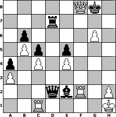 Partie-Notation im PGN-Format [Event "Albspiele 23"] [Site "www.mySchach.de"] [Date "2012.08.08"] [Round "1"] [White "augustus"] [Black "MiFie"] [ECO "C50"] [WhitemyELO "1240"] [BlackmyELO "1209"] [Result "1-0"] [TimeControl "10/1728000"] [WhiteDays "20"] [BlackDays "20"] [MySchachNr "83280"] 1. e4 e5 2. Nf3 Nc6 3. Bc4 Bb4 4. c3 Ba5 5. b4 Bb6 6. O-O Nf6 7. Ng5 Qe7 8. d3 h6 9. Nh3 O-O 10. Kh1 d6 11. Qe2 Bg4 12. f3 Bh5 13. Be3 a5 14. b5 Na7 15. Bxb6 Rad8 16. Bxa7 Ra8 17. Be3 c5 18. Qf2 b6 19. Qg3 g6 20. Bxh6 Rfe8 21. Ng5 d5 22. Bxd5 Nxd5 23. c4 Ne3 24. Rf2 Nd1 25. Rf1 Ne3 26. Rc1 Rad8 27. Rc3 f6 28. Nd2 fxg5 29. Bxg5 Qe6 30. Bxd8 Rxd8 31. Qf2 Nxg2 32. Qxg2 Qf6 33. Rf1 a4 34. a3 Qd6 35. Qg5 Rd7 36. f4 Rf7 37. f5 Qd4 38. Rcc1 Qxd3 39. Rf2 Rd7 40. fxg6 Be2 41. Qf6 Qxd2 42. Qf8# 1-0 Stellungs-Notation im FEN-Format 5Qk1/3r4/1p4P1/1Pp1p3/p1P1P3/P7/3qbR1P/2R4K - - - 1 42 Geschlagene Figuren Weiss: Geschlagene Figuren Schwarz: Klicken Sie auf eine geschlagene Figur um den gewünschten Zug darzustellen!