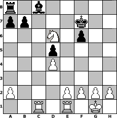 Partie-Notation im PGN-Format [Event "Angreifen mit Kapit"] [Site "www.mySchach.de"] [Date "2013.02.15"] [Round "1"] [White "Vahl1"] [Black "lotchi"] [ECO "C51"] [WhitemyELO "1647"] [BlackmyELO "1243"] [Result "1-0"] [TimeControl "10/2592000"] [WhiteDays "72"] [BlackDays "28"] [MySchachNr "86600"] 1. e4 e5 2. Nf3 Nc6 3. Bc4 Bc5 4. b4 Bxb4 5. c3 Bd6 6. O-O f6 7. d4 exd4 8. Nxd4 Nxd4 9. cxd4 h5 10. Bxg8 Rxg8 11. Qxh5+ g6 12. Qh7 Kf8 13. Bh6+ Ke8 14. Qxg8+ Ke7 15. Qxg6 Qe8 16. Qg7+ Qf7 17. Qxf7+ Kxf7 18. Re1 Bb4 19. Bd2 Bxd2 20. Nxd2 d6 21. Rac1 c6 22. Nc4 d5 23. exd5 cxd5 24. Nd6+ 1-0 Stellungs-Notation im FEN-Format r1b5/pp3k2/3N1p2/3p4/3P4/8/P3PPPP/2R1R1K1 - - - 1 24 Geschlagene Figuren Weiss: Geschlagene Figuren Schwarz: Klicken Sie auf eine geschlagene Figur um den gewünschten Zug darzustellen!