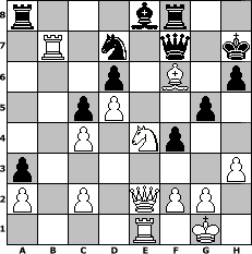 Partie-Notation im PGN-Format [Event "unter uns Nr. 5"] [Site "www.mySchach.de"] [Date "2012.10.15"] [Round "1"] [White "fred521"] [Black "lotchi"] [ECO "C50"] [WhitemyELO "1367"] [BlackmyELO "1388"] [Result "1-0"] [TimeControl "10/864000"] [WhiteDays "10"] [BlackDays "10"] [MySchachNr "84463"] 1. e4 e5 2. Nf3 Nc6 3. Bc4 h6 4. Nc3 Bb4 5. O-O Nf6 6. d3 Bxc3 7. bxc3 d6 8. Rb1 b6 9. Bb5 Bd7 10. h3 a6 11. Bc4 b5 12. Bd5 O-O 13. Nh4 Nxd5 14. exd5 Nb8 15. c4 g5 16. Nf3 bxc4 17. dxc4 e4 18. Nd4 c5 19. Nb3 f6 20. Nd2 f5 21. Qh5 Kh7 22. Rb3 a5 23. Rg3 Be8 24. Qe2 Qe7 25. Bb2 f4 26. Rb3 a4 27. Rb6 Nd7 28. Rb7 Qd8 29. Nxe4 a3 30. Bc3 Qe7 31. Bf6 Qf7 32. Re1 1-0 Stellungs-Notation im FEN-Format r3br2/1R1n1q1k/3p1B1p/2pP2p1/2P1Np2/p6P/P1P1QPP1/4R1K1 - - - 5 32 Geschlagene Figuren Weiss: ![]() ![]() ![]() ![]() ![]() ![]() ![]() ![]() ![]() ![]() ![]() ![]() ![]() ![]() ![]() Geschlagene Figuren Schwarz: ![]() ![]() ![]() ![]() ![]() ![]() ![]() ![]() ![]() ![]() ![]() ![]() ![]() ![]() ![]() Klicken Sie auf eine geschlagene Figur um den gewünschten Zug darzustellen!