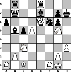 Partie-Notation im PGN-Format [Event "Modernes Benoni"] [Site "www.mySchach.de"] [Date "2010.01.14"] [Round "1"] [White "kari6katz"] [Black "Joschi"] [ECO "A61"] [WhitemyELO "1725"] [BlackmyELO "1570"] [Result "1/2-1/2"] [TimeControl "10/2592000"] [WhiteDays "90"] [BlackDays "87"] [MySchachNr "62387"] 1. d4 Nf6 2. c4 c5 3. d5 e6 4. Nc3 exd5 5. cxd5 d6 6. Nf3 Be7 7. e4 Nbd7 8. Bd3 a6 9. a4 O-O 10. Nd2 Re8 11. O-O Ne5 12. Bc2 Bd7 13. h3 Rb8 14. f4 Ng6 15. e5 dxe5 16. Bxg6 hxg6 17. fxe5 Nh7 18. a5 b5 19. axb6 Qxb6 20. Qe2 Bb5 21. Nc4 Qb7 22. e6 fxe6 23. Qxe6+ Kh8 24. Ne5 Nf6 25. Nf7+ Kh7 26. Ng5+ 1/2-1/2 Stellungs-Notation im FEN-Format 1r2r3/1q2b1pk/p3Qnp1/1bpP2N1/8/2N4P/1P4P1/R1B2RK1 - - - 6 26 Geschlagene Figuren Weiss: Geschlagene Figuren Schwarz: Klicken Sie auf eine geschlagene Figur um den gewünschten Zug darzustellen!
