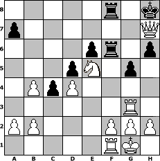 Partie-Notation im PGN-Format [Event "1-2009"] [Site "www.mySchach.de"] [Date "2009.01.01"] [Round "1"] [White "JerryWho"] [Black "Andreas"] [ECO "D02"] [WhitemyELO "1575"] [BlackmyELO "1509"] [Result "1-0"] [TimeControl "10/1728000"] [WhiteDays "22"] [BlackDays "44"] [MySchachNr "51217"] 1. d4 d5 2. Nf3 e6 3. e3 c5 4. c3 Nc6 5. Bd3 c4 6. Bc2 Nf6 7. Nbd2 Be7 8. O-O O-O 9. e4 h6 10. e5 Nh7 11. Re1 Ng5 12. Re3 b5 13. Nxg5 Bxg5 14. Rg3 b4 15. Nf3 Bxc1 16. Qxc1 Kh8 17. Qf4 f5 18. exf6 Qxf6 19. Qc7 Ne7 20. cxb4 Rf7 21. Qc5 Nf5 22. Bxf5 Qxf5 23. Rf1 Bb7 24. Ne5 Rf6 25. Qe7 Qh7 26. Qxb7 Raf8 27. Qe7 g5 28. Qxh7+ 1-0 Stellungs-Notation im FEN-Format 5r1k/p6Q/4pr1p/3pN1p1/1PpP4/6R1/PP3PPP/5RK1 - - - 0 28 Geschlagene Figuren Weiss: Geschlagene Figuren Schwarz: Klicken Sie auf eine geschlagene Figur um den gewünschten Zug darzustellen!