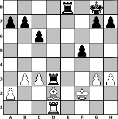 Partie-Notation im PGN-Format [Event "1. Mannschaftsturnier mit young gunz"] [Site "www.mySchach.de"] [Date "2005.09.09"] [Round "2"] [Board "3"] [White "jlarue700"] [Black "Anonymus"] [ECO "C42"] [WhitemyELO "1584"] [BlackmyELO "1566"] [Result "0-1"] [TimeControl "10/2592000"] [WhiteDays "78"] [BlackDays "72"] [MySchachNr "17146"] 1. e4 e5 2. Nf3 Nf6 3. Bc4 Nxe4 4. Nxe5 d5 5. Bd3 Nxf2 6. Kxf2 Qf6+ 7. Nf3 Bc5+ 8. Kf1 O-O 9. Nc3 c6 10. Be2 Bg4 11. Qe1 d4 12. Ne4 Qf5 13. Nxc5 Qxc5 14. c3 dxc3 15. dxc3 Nd7 16. Nd4 Bxe2+ 17. Qxe2 Rfe8 18. Qf2 Qc4+ 19. Kg1 Re4 20. g3 Rae8 21. Bd2 Nf6 22. b3 Qd3 23. Rd1 Ng4 24. Qf3 Rxd4 25. Qxd3 Rxd3 26. h3 Ne3 27. Kf2 Nxd1+ 28. Rxd1 f5 0-1 Stellungs-Notation im FEN-Format 4r1k1/pp4pp/2p5/5p2/8/1PPr2PP/P2B1K2/3R4 - - - 0 29 Geschlagene Figuren Weiss: Geschlagene Figuren Schwarz: Klicken Sie auf eine geschlagene Figur um den gewünschten Zug darzustellen!