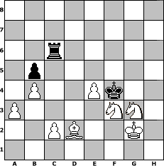Partie-Notation im PGN-Format [Event "Turnier in den M"] [Site "www.mySchach.de"] [Date "2014.02.19"] [Round "1"] [White "lotchi"] [Black "hape50"] [ECO "A04"] [WhitemyELO "1284"] [BlackmyELO "1284"] [Result "1-0"] [TimeControl "10/2592000"] [WhiteDays "30"] [BlackDays "30"] [MySchachNr "93072"] 1. Nf3 d6 2. Nc3 h6 3. e4 e5 4. Bb5+ c6 5. Be2 Ne7 6. d3 Ng6 7. g3 Be7 8. Be3 a6 9. O-O O-O 10. a3 Nd7 11. Qd2 Bf6 12. b4 b5 13. h4 Re8 14. Nh2 Bxh4 15. gxh4 Nxh4 16. Bg4 Qf6 17. Bxd7 Bxd7 18. f3 Qg6+ 19. Kh1 Bh3 20. Rg1 Bg2+ 21. Rxg2 Nxg2 22. Qxg2 Qxg2+ 23. Kxg2 Rac8 24. Bd2 g5 25. Ng4 Kg7 26. Rh1 Rh8 27. Be1 Kg6 28. Bd2 f6 29. Rf1 h5 30. Ne3 Rh7 31. Nf5 Rd8 32. Rh1 h4 33. Be3 Rh5 34. Kh3 d5 35. exd5 cxd5 36. Ne7+ Kh6 37. Ncxd5 Rf8 38. Bc5 Rf7 39. Nc7 f5 40. Nxa6 g4+ 41. fxg4 fxg4+ 42. Kh2 Rf3 43. Re1 h3 44. Kg1 g3 45. Nd5 e4 46. dxe4 Kg6 47. Be3 Rh4 48. Nc5 Kh5 49. Nd7 Kg6 50. Ne7+ Kh5 51. Ne5 Rf6 52. Bd4 Re6 53. Nf5 h2+ 54. Kg2 h1=Q+ 55. Rxh1 Rxh1 56. Nxg3+ Kg5 57. Kxh1 Kf4 58. Kg2 Rd6 59. Bc3 Re6 60. Nf3 Rc6 61. Bd2+ 1-0 Stellungs-Notation im FEN-Format 8/8/2r5/1p6/1P2Pk2/P4NN1/2PB2K1/8 - - - 8 61 Geschlagene Figuren Weiss: Geschlagene Figuren Schwarz: Klicken Sie auf eine geschlagene Figur um den gewünschten Zug darzustellen!