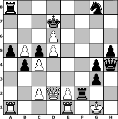Partie-Notation im PGN-Format [Event "Winterende2014"] [Site "www.mySchach.de"] [Date "2014.03.06"] [Round "1"] [White "Schachboy1"] [Black "Kyros537"] [ECO "C40"] [WhitemyELO "1439"] [BlackmyELO "1456"] [Result "0-1"] [TimeControl "10/1728000"] [WhiteDays "60"] [BlackDays "60"] [MySchachNr "93362"] 1. e4 e5 2. Nf3 f6 3. d4 c5 4. d5 a6 5. Bd3 g5 6. O-O b5 7. Nxe5 fxe5 8. Nc3 h5 9. Re1 d6 10. a4 b4 11. Nb1 a5 12. Bb5+ Bd7 13. Nd2 Bxb5 14. axb5 Nf6 15. h3 g4 16. h4 Bh6 17. Nc4 Bxc1 18. Qxc1 Ng8 19. b3 Rh6 20. g3 Nd7 21. f4 Rf6 22. Rf1 Nb6 23. Re1 Nxc4 24. bxc4 exf4 25. e5 Rf5 26. exd6+ Kd7 27. Re6 fxg3 28. Re1 Qxh4 29. Qd2 Rf2 0-1 Stellungs-Notation im FEN-Format r5n1/3k4/3P4/pPpP3p/1pP3pq/6p1/2PQPr2/R3R1K1 - - - 2 30 Geschlagene Figuren Weiss: Geschlagene Figuren Schwarz: Klicken Sie auf eine geschlagene Figur um den gewünschten Zug darzustellen!