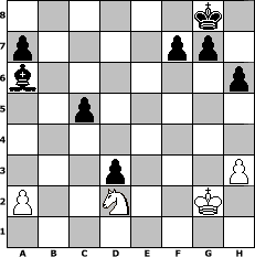 Partie-Notation im PGN-Format [Event "Zur Fastenzeit"] [Site "www.mySchach.de"] [Date "2018.03.15"] [Round "1"] [White "miu"] [Black "spiderman"] [ECO "E10"] [WhitemyELO "1518"] [BlackmyELO "1801"] [Result "0-1"] [TimeControl "10/3456000"] [WhiteDays "40"] [BlackDays "38"] [MySchachNr "111757"] 1. d4 Nf6 2. c4 e6 3. Nf3 Nc6 4. Nc3 Bb4 5. Bg5 h6 6. Bxf6 Qxf6 7. e4 d6 8. Be2 Bxc3+ 9. bxc3 O-O 10. O-O e5 11. d5 Ne7 12. Rb1 b6 13. Ne1 Qg5 14. f4 exf4 15. Nf3 Qf6 16. Qd4 Qxd4+ 17. cxd4 Re8 18. h3 Nf5 19. Rfe1 Rxe4 20. Bd3 Re3 21. Rxe3 Nxe3 22. Nd2 Ba6 23. Kf2 Re8 24. Rc1 Nxd5 25. Re1 Rxe1 26. Kxe1 Ne3 27. Kf2 d5 28. Kf3 dxc4 29. Kxf4 Nxg2+ 30. Kg3 cxd3 31. Kxg2 c5 32. dxc5 bxc5 0-1 Stellungs-Notation im FEN-Format 6k1/p4pp1/b6p/2p5/8/3p3P/P2N2K1/8 - - - 0 33 Geschlagene Figuren Weiss: Geschlagene Figuren Schwarz: Klicken Sie auf eine geschlagene Figur um den gewünschten Zug darzustellen!