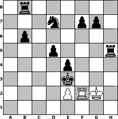 | Partie-Notation im PGN-Format [Event "Albspiele 27"] [Site "www.mySchach.de"] [Date "2013.02.10"] [Round "1"] [White "Hobbykegler"] [Black "borsti"] [ECO "B20"] [WhitemyELO "1111"] [BlackmyELO "1279"] [Result "0-1"] [TimeControl "10/1728000"] [WhiteDays "20"] [BlackDays "20"] [MySchachNr "86475"] 1. e4 c5 2. d4 cxd4 3. c3 dxc3 4. Nxc3 e5 5. g3 d6 6. Nd5 Be6 7. Be3 Nf6 8. Rc1 Bxd5 9. exd5 Qa5+ 10. Rc3 Nbd7 11. a3 Nxd5 12. Qd2 Nxc3 13. Qxc3 Qxc3+ 14. bxc3 d5 15. Nf3 Rc8 16. Bxa7 Bxa3 17. Bb5 Ke7 18. O-O e4 19. Nd4 Rxc3 20. Nf5+ Kd8 21. Rd1 Nf6 22. Bb6+ Kc8 23. Nd6+ Bxd6 24. Ra1 Rg8 25. Ra8+ Bb8 26. Ba7 Kc7 27. Bd4 Rc1+ 28. Kg2 Rd8 29. Be5+ Kb6 30. Bxb8 Kxb5 31. h4 Rdc8 32. Kh3 h5 33. Kg2 Nd7 34. Ra2 Rxb8 35. Rb2+ Kc4 36. Kh3 b6 37. g4 Rh1+ 38. Kg2 Rxh4 39. Rc2+ Kd4 40. Rd2+ Ke5 41. gxh5 Rxh5 42. f4+ Kxf4 43. Rf2+ Ke3 0-1 Stellungs-Notation im FEN-Format 1r6/3n1pp1/1p6/3p3r/4p3/4k3/4PRK1/8 - - - 2 44 Geschlagene Figuren Weiss:                              Geschlagene Figuren Schwarz:                               Klicken Sie auf eine geschlagene Figur um den gewünschten Zug darzustellen!