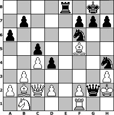 Partie-Notation im PGN-Format [Event "my schach.de darf nicht einschlafen!!"] [Site "www.mySchach.de"] [Date "2018.08.17"] [Round "1"] [White "Hobbykegler"] [Black "kalle"] [ECO "A15"] [WhitemyELO "1010"] [BlackmyELO "1688"] [Result "0-1"] [TimeControl "10/1728000"] [WhiteDays "11"] [BlackDays "19"] [MySchachNr "112859"] 1. c4 Nf6 2. b3 c5 3. Bb2 e6 4. Qc2 d5 5. Na3 Nc6 6. e3 Bd6 7. Be2 O-O 8. Nh3 e5 9. O-O Bxh3 10. gxh3 d4 11. exd4 exd4 12. Nb5 Bf4 13. Rae1 a6 14. Na3 Qc7 15. Kh1 Rfe8 16. Bd3 Ne5 17. Bf5 Nf3 18. Rxe8+ Rxe8 19. Nb1 Bxh2 20. Na3 Qd6 21. Kg2 Qf4 22. Nb1 Nh4+ 23. Kh1 Qf3+ 24. Kxh2 Qg2# 0-1 Stellungs-Notation im FEN-Format 4r1k1/1p3ppp/p4n2/2p2B2/2Pp3n/1P5P/PBQP1PqK/1N3R2 - - - 1 25 Geschlagene Figuren Weiss: Geschlagene Figuren Schwarz: Klicken Sie auf eine geschlagene Figur um den gewünschten Zug darzustellen!