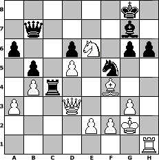 Partie-Notation im PGN-Format [Event "Trotz Sturm und Regen die Figuren bewegen II"] [Site "www.mySchach.de"] [Date "2025.08.15"] [Round "1"] [White "Grubengeist"] [Black "jeremyt"] [ECO "C60"] [WhitemyELO "2167"] [BlackmyELO "2105"] [Result "1/2-1/2"] [TimeControl "10/2592000"] [WhiteDays "118"] [BlackDays "091"] [MySchachNr "133590"] 1. e4 e5 2. Nf3 Nc6 3. Bb5 Nge7 4. O-O g6 5. c3 a6 6. Ba4 Bg7 7. d4 exd4 8. cxd4 b5 9. Bb3 O-O 10. Nc3 d6 11. Nd5 h6 12. Nxe7+ Qxe7 13. Bd5 Bb7 14. Re1 Nd8 15. Be3 Re8 16. Rc1 Rc8 17. b4 Bxd5 18. exd5 Qd7 19. Qc2 c6 20. h3 Kh7 21. Red1 Re7 22. dxc6 Nxc6 23. d5 Na7 24. Qd3 Qb7 25. h4 Rec7 26. h5 Rxc1 27. Bxc1 Rc4 28. g3 Nc8 29. Bf4 Qd7 30. hxg6+ fxg6 31. Kg2 Ne7 32. a3 Nf5 33. Rh1 Qb7 34. Ng5+ Kg8 35. Ne6 1/2-1/2 Stellungs-Notation im FEN-Format 6k1/1q4b1/p2pN1pp/1p1P1n2/1Pr2B2/P2Q2P1/4PPK1/7R - - - 6 35 Geschlagene Figuren Weiss: ![]() ![]() ![]() ![]() ![]() ![]() ![]() ![]() ![]() ![]() ![]() ![]() ![]() ![]() ![]() Geschlagene Figuren Schwarz: ![]() ![]() ![]() ![]() ![]() ![]() ![]() ![]() ![]() ![]() ![]() ![]() ![]() ![]() ![]() Klicken Sie auf eine geschlagene Figur um den gewünschten Zug darzustellen!
