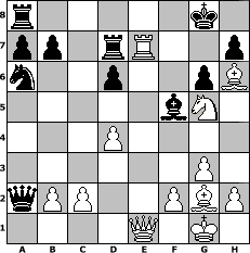 Partie-Notation im PGN-Format [Event "Cremlinger Open 1"] [Site "www.mySchach.de"] [Date "2009.11.19"] [Round "1"] [White "Fedkopv"] [Black "espero"] [ECO "A10"] [WhitemyELO "1820"] [BlackmyELO "1674"] [Result "1-0"] [TimeControl "10/1728000"] [WhiteDays "38"] [BlackDays "21"] [MySchachNr "60818"] 1. c4 f5 2. g3 Nf6 3. d4 g6 4. Bg2 Bg7 5. Nf3 O-O 6. O-O d6 7. Nc3 Qe8 8. Re1 Qf7 9. e4 fxe4 10. Nxe4 Qxc4 11. Nxf6+ Bxf6 12. Bh6 Rd8 13. Rc1 Qxa2 14. Rxc7 Na6 15. Rcxe7 Bxe7 16. Rxe7 Bf5 17. Ng5 Rd7 18. Qe1 1-0 Stellungs-Notation im FEN-Format r5k1/pp1rR2p/n2p2pB/5bN1/3P4/6P1/qPP2PBP/4Q1K1 - - - 4 18 Geschlagene Figuren Weiss: Geschlagene Figuren Schwarz: Klicken Sie auf eine geschlagene Figur um den gewünschten Zug darzustellen!