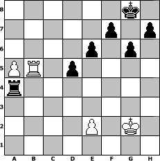 Partie-Notation im PGN-Format [Event "Sweety Tunier"] [Site "www.mySchach.de"] [Date "2006.02.28"] [Round "1"] [White "Master1"] [Black "AlbertoAveiro"] [ECO "B20"] [WhitemyELO "1099"] [BlackmyELO "1517"] [Result "0-1"] [TimeControl "10/2592000"] [WhiteDays "106"] [BlackDays "037"] [MySchachNr "22965"] 1. e4 c5 2. Bc4 e6 3. Nf3 Nc6 4. O-O Nf6 5. Nc3 a6 6. d4 cxd4 7. Nxd4 Be7 8. Nxc6 bxc6 9. e5 Nd5 10. Nxd5 cxd5 11. Bb3 O-O 12. c4 dxc4 13. Bxc4 Bb7 14. Bf4 Rc8 15. b3 Ra8 16. Qg4 Re8 17. Bh6 g6 18. Bd3 Bf8 19. Be4 Bxe4 20. Bxf8 Bxg2 21. Qxg2 Rxf8 22. a4 Qb6 23. Qf3 Rac8 24. a5 Qb5 25. Qe3 Rc5 26. Rac1 Rxe5 27. Qd2 Rg5+ 28. Kh1 Qd5+ 29. Qxd5 Rxd5 30. b4 Rb8 31. Rc4 Rd2 32. Rb1 Rxf2 33. h4 d5 34. Rc5 Rf4 35. b5 Rxh4+ 36. Kg2 axb5 37. Rcxb5 Rxb5 38. Rxb5 Ra4 0-1 Stellungs-Notation im FEN-Format 6k1/5p1p/4p1p1/PR1p4/r7/8/4P1K1/8 - - - 1 39 Geschlagene Figuren Weiss: Geschlagene Figuren Schwarz: Klicken Sie auf eine geschlagene Figur um den gewünschten Zug darzustellen!