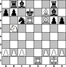 Partie-Notation im PGN-Format [Event "Wrixum - Open die VIII"] [Site "www.mySchach.de"] [Date "2011.01.17"] [Round "1"] [White "Achimkogge"] [Black "Master1"] [ECO "C22"] [WhitemyELO "1373"] [BlackmyELO "1305"] [Result "1-0"] [TimeControl "10/2592000"] [WhiteDays "30"] [BlackDays "30"] [MySchachNr "71335"] 1. e4 e5 2. d4 exd4 3. Qxd4 Nf6 4. e5 Qe7 5. Be2 Ng8 6. Nf3 Nc6 7. Qd1 Nxe5 8. O-O Nxf3+ 9. Bxf3 Qd6 10. Re1+ Ne7 11. Qxd6 cxd6 12. Bf4 g6 13. Bxd6 h6 14. Be5 Rg8 15. Bf6 d6 16. Bd5 Rb8 17. Nc3 Kd7 18. Bb3 Ke8 19. Rad1 Kd7 20. Nb5 Nc6 21. Bxf7 Bg7 22. Rxd6# 1-0 Stellungs-Notation im FEN-Format 1rb3r1/pp1k1Bb1/2nR1Bpp/1N6/8/8/PPP2PPP/4R1K1 - - - 0 22 Geschlagene Figuren Weiss: Geschlagene Figuren Schwarz: Klicken Sie auf eine geschlagene Figur um den gewünschten Zug darzustellen!
