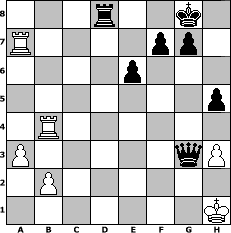 Partie-Notation im PGN-Format [Event "unter uns Nr. 23"] [Site "www.mySchach.de"] [Date "2014.10.24"] [Round "1"] [White "Winston"] [Black "Master1"] [ECO "B10"] [WhitemyELO "1449"] [BlackmyELO "1368"] [Result "0-1"] [TimeControl "10/864000"] [WhiteDays "52"] [BlackDays "48"] [MySchachNr "96483"] 1. e4 c6 2. e5 d6 3. exd6 Qxd6 4. h3 Nf6 5. Nf3 e6 6. a3 Be7 7. Nc3 Nbd7 8. Bc4 Nb6 9. Ba2 h6 10. d3 O-O 11. Be3 Nbd5 12. Bd4 Nxc3 13. Bxc3 Bd7 14. Qe2 Rab8 15. Be5 Qc5 16. Bxb8 Rxb8 17. Bb3 Qb6 18. O-O Bd6 19. Rad1 a5 20. c4 Qxb3 21. d4 c5 22. dxc5 Bxc5 23. Ne5 Qa4 24. Rd3 Be8 25. Rfd1 Be7 26. Qd2 Nd7 27. Nxd7 Bxd7 28. Rxd7 Bf6 29. Qf4 Re8 30. Qc7 Rf8 31. Qxb7 Qxc4 32. Qb6 a4 33. Kh1 Qc8 34. Rc7 Qb8 35. Rb7 Qa8 36. Rdd7 Be5 37. Qb5 Bf6 38. Qh5 Qe8 39. Qb5 Qc8 40. Rdc7 Qa8 41. f4 Bd8 42. Rc4 Bf6 43. Rxa4 Qc8 44. Qb3 h5 45. Raa7 Qc1+ 46. Kh2 Qxf4+ 47. Kh1 Qf1+ 48. Kh2 Be5+ 49. g3 Qf2+ 50. Kh1 Bxg3 51. Qxg3 Qxg3 52. Rb4 Rd8 0-1 Stellungs-Notation im FEN-Format 3r2k1/R4pp1/4p3/7p/1R6/P5qP/1P6/7K - - - 2 53 Geschlagene Figuren Weiss: Geschlagene Figuren Schwarz: Klicken Sie auf eine geschlagene Figur um den gewünschten Zug darzustellen!