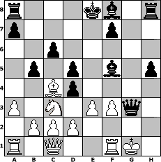 Partie-Notation im PGN-Format [Event "CAISSA.COM IS DEAD TO ME!"] [Site "www.mySchach.de"] [Date "2020.03.28"] [Round "2"] [White "borsti"] [Black "martinus"] [ECO "A45"] [WhitemyELO "1244"] [BlackmyELO "1575"] [Result "0-1"] [TimeControl "10/2592000"] [WhiteDays "30"] [BlackDays "30"] [MySchachNr "117772"] 1. d4 Nf6 2. Bg5 Ne4 3. Bh4 g5 4. Bg3 Nxg3 5. hxg3 d5 6. Nf3 g4 7. Ne5 Bf5 8. e3 Nd7 9. Bb5 c6 10. Ba4 Nxe5 11. Nc3 Nc4 12. Qc1 Qd6 13. Bb3 b5 14. a3 e5 15. O-O h5 16. f4 gxf3 17. gxf3 exd4 18. Bxc4 Qxg3+ 0-1 Stellungs-Notation im FEN-Format r3kb1r/p4p2/2p5/1p1p1b1p/2Bp4/P1N1PPq1/1PPP4/R1Q2RK1 - kq - 0 19 Geschlagene Figuren Weiss: Geschlagene Figuren Schwarz: Klicken Sie auf eine geschlagene Figur um den gewünschten Zug darzustellen!