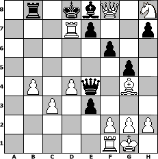 Partie-Notation im PGN-Format [Event "Helmut-Rahn-Gedenkturnier"] [Site "www.mySchach.de"] [Date "2003.08.28"] [Round "1"] [White "myfairlady"] [Black "Blacky"] [ECO "D02"] [WhitemyELO "1542"] [BlackmyELO "1542"] [Result "1-0"] [TimeControl "10/3456000"] [WhiteDays "116"] [BlackDays "067"] [MySchachNr "923"] 1. d4 d5 2. Nf3 b5 3. Bf4 Nf6 4. e3 c6 5. a4 Qa5+ 6. Nbd2 bxa4 7. c3 c5 8. Rxa4 Qb6 9. b4 cxd4 10. exd4 Ne4 11. Nxe4 dxe4 12. Ne5 f6 13. Qh5+ Kd8 14. Nf7+ Kd7 15. Qd5+ Ke8 16. Nxh8 Bd7 17. Qf7+ Kd8 18. Qxf8+ Be8 19. Be2 Qe6 20. O-O g5 21. Bxb8 Rxb8 22. Rxa7 e3 23. Bg4 Qe4 24. Rd7+ 1-0 Stellungs-Notation im FEN-Format 1r1kbQ1N/3Rp2p/5p2/6p1/1P1Pq1B1/2P1p3/5PPP/5RK1 - - - 3 24 Geschlagene Figuren Weiss: Geschlagene Figuren Schwarz: Klicken Sie auf eine geschlagene Figur um den gewünschten Zug darzustellen!