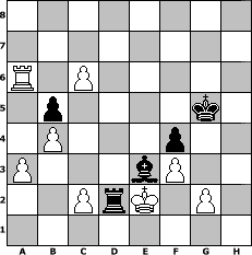 Partie-Notation im PGN-Format [Event "Turnier in den M"] [Site "www.mySchach.de"] [Date "2014.02.19"] [Round "1"] [White "Mattheus"] [Black "hape50"] [ECO "D00"] [WhitemyELO "1218"] [BlackmyELO "1284"] [Result "0-1"] [TimeControl "10/2592000"] [WhiteDays "29"] [BlackDays "30"] [MySchachNr "93096"] 1. d4 d5 2. e4 dxe4 3. Nc3 h6 4. Nxe4 e6 5. Nf3 Nf6 6. Bd3 Be7 7. O-O a6 8. Re1 O-O 9. Nc3 b5 10. a3 c5 11. Be4 Ra7 12. Nh4 Nh7 13. Bxh7+ Kxh7 14. Qd3+ Kg8 15. Bxh6 gxh6 16. Qg3+ Kh7 17. dxc5 Bxh4 18. Qe3 Nc6 19. Qe4+ f5 20. Qxc6 Rc7 21. Qb6 Rff7 22. b4 Rc6 23. Qxd8 Bxd8 24. h3 Bf6 25. Re3 Bd4 26. Rf3 Bb7 27. Rd1 Bf6 28. Rg3 Be5 29. Rd3 f4 30. Rd7 Rxd7 31. Rxd7+ Kg6 32. Rxb7 Bxc3 33. Rb6 Rc8 34. Rxe6+ Kg5 35. h4+ Kh5 36. Re4 Kg4 37. f3+ Kg3 38. Re6 Rd8 39. Rg6+ Kxh4 40. Rxh6+ Kg5 41. Rxa6 Bd4+ 42. Kf1 Be3 43. c6 Rd1+ 44. Ke2 Rd2+ 0-1 Stellungs-Notation im FEN-Format 8/8/R1P5/1p4k1/1P3p2/P3bP2/2PrK1P1/8 - - - 3 45 Geschlagene Figuren Weiss: Geschlagene Figuren Schwarz: Klicken Sie auf eine geschlagene Figur um den gewünschten Zug darzustellen!