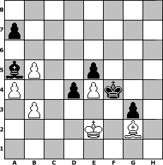 Partie-Notation im PGN-Format [Event "Ab in den Herbst"] [Site "www.mySchach.de"] [Date "2014.09.23"] [Round "1"] [White "FrankB"] [Black "sprinterde"] [ECO "A40"] [WhitemyELO "1730"] [BlackmyELO "1744"] [Result "1/2-1/2"] [TimeControl "10/864000"] [WhiteDays "09"] [BlackDays "10"] [MySchachNr "96026"] 1. d4 e6 2. Nf3 Nf6 3. c4 c5 4. Nc3 Nc6 5. d5 Nb4 6. e4 Qa5 7. Bd2 Na6 8. e5 Ng8 9. d6 Qb6 10. Rb1 f6 11. Na4 Qc6 12. Bf4 b5 13. cxb5 Qe4+ 14. Be3 Nb4 15. Nc3 Nc2+ 16. Kd2 Nxe3 17. Nxe4 Nxd1 18. Kxd1 Bb7 19. Nxc5 Bxf3+ 20. gxf3 fxe5 21. Ne4 Nf6 22. Rg1 Nxe4 23. fxe4 g6 24. Rc1 Bxd6 25. Bd3 O-O 26. Ke2 Bb8 27. a4 d5 28. Rc6 Kf7 29. Rgc1 Rd8 30. Rc8 Bd6 31. Rxa8 Rxa8 32. b3 Ke7 33. f3 Kd7 34. h3 Rb8 35. Kf2 Rc8 36. Rxc8 Kxc8 37. Ke2 Bb4 38. Bc2 Kc7 39. Ke3 Bc5+ 40. Kd3 Kb6 41. Kc3 Ka5 42. Bd3 Bb4+ 43. Kc2 Kb6 44. Be2 Kc5 45. Kd3 Ba5 46. Bd1 Kd6 47. Bc2 Ke7 48. Ke3 Kf6 49. f4 d4+ 50. Kf3 exf4 51. Kxf4 e5+ 52. Kf3 Kg5 53. Bd3 h5 54. Bc4 Kh4 55. Kg2 g5 56. Be2 g4 57. hxg4 hxg4 58. Bf1 g3 59. Kf3 Bc3 60. Ke2 Kg4 61. Bg2 Kf4 62. Kd3 Ba5 63. Ke2 1/2-1/2 Stellungs-Notation im FEN-Format 8/p7/8/bP2p3/P2pPk2/1P4p1/4K1B1/8 - - - 9 63 Geschlagene Figuren Weiss: ![]() ![]() ![]() ![]() ![]() ![]() ![]() ![]() ![]() ![]() ![]() ![]() ![]() ![]() ![]() Geschlagene Figuren Schwarz: ![]() ![]() ![]() ![]() ![]() ![]() ![]() ![]() ![]() ![]() ![]() ![]() ![]() ![]() ![]() Klicken Sie auf eine geschlagene Figur um den gewünschten Zug darzustellen!