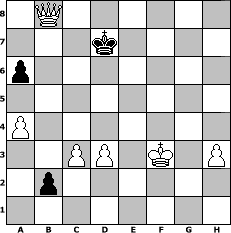 Partie-Notation im PGN-Format [Event "Ostern 2011"] [Site "www.mySchach.de"] [Date "2011.03.18"] [Round "1"] [White "ujack1961"] [Black "Gauss1233"] [ECO "B20"] [WhitemyELO "1671"] [BlackmyELO "1419"] [Result "1-0"] [TimeControl "10/2592000"] [WhiteDays "146"] [BlackDays "119"] [MySchachNr "72763"] 1. e4 c5 2. Bc4 e6 3. f4 d5 4. exd5 exd5 5. Qe2+ Be7 6. Bb5+ Bd7 7. Nf3 Bxb5 8. Qxb5+ Qd7 9. Qxd7+ Nxd7 10. O-O O-O-O 11. Nc3 Ngf6 12. d3 d4 13. Ne4 Kb8 14. Nfg5 Rdf8 15. Nxf6 Bxf6 16. Ne4 Be7 17. f5 b6 18. Bf4+ Ka8 19. a4 Kb7 20. Rae1 f6 21. Nd6+ Bxd6 22. Bxd6 Re8 23. Re4 Rxe4 24. dxe4 Kc6 25. Bf4 Ne5 26. Bxe5 fxe5 27. f6 gxf6 28. Rxf6+ Kc7 29. Re6 c4 30. Rxe5 Rd8 31. Re7+ Rd7 32. Rxd7+ Kxd7 33. Kf2 Ke6 34. Kf3 Ke5 35. g3 h5 36. h3 a6 37. g4 b5 38. gxh5 b4 39. h6 Kf6 40. e5+ Kg6 41. e6 d3 42. cxd3 c3 43. bxc3 b3 44. e7 Kf7 45. h7 b2 46. e8=Q+ Kxe8 47. h8=Q+ Kd7 48. Qb8 1-0 Stellungs-Notation im FEN-Format 1Q6/3k4/p7/8/P7/2PP1K1P/1p6/8 - - - 2 48 Geschlagene Figuren Weiss: Geschlagene Figuren Schwarz: Klicken Sie auf eine geschlagene Figur um den gewünschten Zug darzustellen!