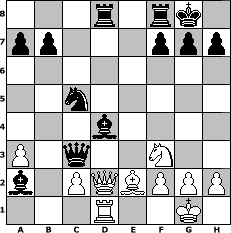 Partie-Notation im PGN-Format [Event "Orang - Utan"] [Site "www.mySchach.de"] [Date "2012.03.06"] [Round "1"] [White "Knight"] [Black "HenrySchinasky"] [ECO "A00"] [WhitemyELO "1261"] [BlackmyELO "2107"] [Result "0-1"] [TimeControl "10/2592000"] [WhiteDays "89"] [BlackDays "52"] [MySchachNr "80355"] 1. b4 Nf6 2. Bb2 e6 3. Nf3 Bxb4 4. a3 Be7 5. e3 O-O 6. d4 d5 7. Bd3 c5 8. dxc5 Nbd7 9. O-O Nxc5 10. Bxf6 Bxf6 11. Ra2 e5 12. Be2 Be6 13. Nc3 d4 14. exd4 exd4 15. Nb5 Bxa2 16. Nbxd4 Qa5 17. Qc1 Rad8 18. Rd1 Qc3 19. Qd2 Bxd4 0-1 Stellungs-Notation im FEN-Format 3r1rk1/pp3ppp/8/2n5/3b4/P1q2N2/b1PQBPPP/3R2K1 - - - 0 20 Geschlagene Figuren Weiss: Geschlagene Figuren Schwarz: Klicken Sie auf eine geschlagene Figur um den gewünschten Zug darzustellen!