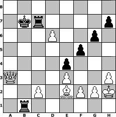 Partie-Notation im PGN-Format [Event "Zwischendurch mal ein paar eigene Z"] [Site "www.mySchach.de"] [Date "2009.02.10"] [Round "1"] [White "rgHD"] [Black "Dali"] [ECO "A16"] [WhitemyELO "1556"] [BlackmyELO "1673"] [Result "1-0"] [TimeControl "10/1728000"] [WhiteDays "58"] [BlackDays "65"] [MySchachNr "52607"] 1. c4 Nf6 2. Nc3 d5 3. cxd5 Nxd5 4. Nf3 Nxc3 5. bxc3 Nc6 6. Ba3 Bg4 7. e3 Qd5 8. Be2 O-O-O 9. O-O Kb8 10. d4 Qf5 11. h3 Bxf3 12. Bxf3 Qd7 13. Qb3 e6 14. Bxf8 Rhxf8 15. Rfb1 b6 16. a4 Ne7 17. a5 f6 18. axb6 cxb6 19. Qa3 Nc8 20. c4 e5 21. c5 Qc7 22. cxb6 Nxb6 23. Rc1 Qxc1+ 24. Rxc1 Rfe8 25. Qa6 e4 26. Bg4 g6 27. Ra1 Re7 28. Rb1 f5 29. Be2 Rc8 30. Rxb6+ axb6 31. Qxb6+ Rb7 32. Qd6+ Ka7 33. Ba6 Rc1+ 34. Kh2 Rc7 35. Qa3 Kb6 36. Be2 Kb7 37. d5 Rb1 38. d6 1-0 Stellungs-Notation im FEN-Format 8/1kr4p/3P2p1/5p2/4p3/Q3P2P/2P1BPPK/1r6 - - - 0 38 Geschlagene Figuren Weiss: Geschlagene Figuren Schwarz: Klicken Sie auf eine geschlagene Figur um den gewünschten Zug darzustellen!