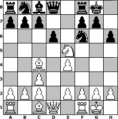 Partie-Notation im PGN-Format [Event "Herbstturnier 2"] [Site "www.mySchach.de"] [Date "2011.10.05"] [Round "1"] [White "Steppenwolf"] [Black "Caligula"] [ECO "C42"] [WhitemyELO "1106"] [BlackmyELO "1390"] [Result "0-1"] [TimeControl "10/1728000"] [WhiteDays "00"] [BlackDays "20"] [MySchachNr "76600"] 1. e4 e5 2. Nf3 Nf6 3. Nc3 Bb4 4. Bc4 h6 5. Nxe5 O-O 6. O-O Bxc3 7. dxc3 d6 0-1 Stellungs-Notation im FEN-Format rnbq1rk1/ppp2pp1/3p1n1p/4N3/2B1P3/2P5/PPP1PPPP/R1BQ1RK1 - - - 0 8 Geschlagene Figuren Weiss: Geschlagene Figuren Schwarz: Klicken Sie auf eine geschlagene Figur um den gewünschten Zug darzustellen!