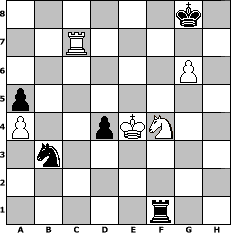 Partie-Notation im PGN-Format [Event "Neujahrsturnier 2014"] [Site "www.mySchach.de"] [Date "2014.01.01"] [Round "1"] [White "bjeu"] [Black "jeremyt"] [ECO "C47"] [WhitemyELO "2174"] [BlackmyELO "2051"] [Result "1-0"] [TimeControl "10/3456000"] [WhiteDays "042"] [BlackDays "171"] [MySchachNr "91927"] 1. e4 e5 2. Nf3 Nc6 3. Nc3 Nf6 4. d4 exd4 5. Nxd4 Bb4 6. Nxc6 bxc6 7. Bd3 d5 8. exd5 cxd5 9. Qe2+ Be7 10. O-O c6 11. Re1 Be6 12. Bf4 O-O 13. a3 Bd6 14. Qd2 a5 15. Ne2 c5 16. b3 h6 17. a4 Qc7 18. Rad1 d4 19. Bxh6 Bxh2+ 20. Kf1 Nh5 21. Bxg7 Nxg7 22. Qh6 Bf5 23. g3 Bxd3 24. Rxd3 Rae8 25. Qxh2 Re4 26. Rdd1 Rfe8 27. Nf4 Qc6 28. Qh3 f5 29. Rxe4 fxe4 30. Kg1 e3 31. Qg2 Qxg2+ 32. Kxg2 Nf5 33. Rh1 exf2 34. Kxf2 Re3 35. g4 Nd6 36. Rh3 Ne4+ 37. Kg2 Re1 38. Rh5 Rc1 39. Kf3 Nd2+ 40. Ke2 Rxc2 41. Kd3 Ra2 42. Rxc5 Nxb3 43. Rc8+ Kg7 44. g5 Rf2 45. Ke4 Rf1 46. Rc7+ Kg8 47. g6 1-0 Stellungs-Notation im FEN-Format 6k1/2R5/6P1/p7/P2pKN2/1n6/8/5r2 - - - 0 47 Geschlagene Figuren Weiss: Geschlagene Figuren Schwarz: Klicken Sie auf eine geschlagene Figur um den gewünschten Zug darzustellen!