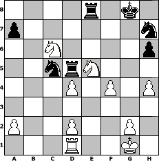 Partie-Notation im PGN-Format [Event "1.Schaltjahresturnier@mySchach"] [Site "www.mySchach.de"] [Date "2004.02.29"] [Round "1"] [White "kalle"] [Black "Naunhofer"] [ECO "D51"] [WhitemyELO "1681"] [BlackmyELO "1481"] [Result "0-1"] [TimeControl "10/1728000"] [WhiteDays "74"] [BlackDays "80"] [MySchachNr "2590"] 1. d4 d5 2. c4 e6 3. Nc3 Nf6 4. Bg5 Nbd7 5. e3 Be7 6. Nf3 O-O 7. Qc2 h6 8. h4 Nh7 9. Bxe7 Qxe7 10. cxd5 Ndf6 11. Bd3 Rd8 12. dxe6 Bxe6 13. O-O c6 14. Na4 Bd5 15. e4 Bxe4 16. Rfe1 Bxd3 17. Qxd3 Qb4 18. b3 Rd7 19. Nc5 Rd5 20. Qc4 Qb6 21. Re7 Rb8 22. Ne5 Qd8 23. Rxf7 b5 24. Rxg7+ Kxg7 25. Ne6+ Kg8 26. Nxd8 bxc4 27. Ndxc6 Re8 28. bxc4 Rd6 29. f4 Nd7 30. c5 Rd5 31. Rd1 Nxc5 0-1 Stellungs-Notation im FEN-Format 4r1k1/p6n/2N4p/2nrN3/3P1P1P/8/P2P2P1/3R2K1 - - - 0 32 Geschlagene Figuren Weiss: ![]() ![]() ![]() ![]() ![]() ![]() ![]() ![]() ![]() ![]() ![]() ![]() ![]() ![]() ![]() Geschlagene Figuren Schwarz: ![]() ![]() ![]() ![]() ![]() ![]() ![]() ![]() ![]() ![]() ![]() ![]() ![]() ![]() ![]() Klicken Sie auf eine geschlagene Figur um den gewünschten Zug darzustellen!
