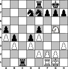 Partie-Notation im PGN-Format [Event "Herbstturnier 2022"] [Site "www.mySchach.de"] [Date "2022.09.26"] [Round "2"] [White "MiFie"] [Black "alibengali"] [ECO "B01"] [WhitemyELO "1087"] [BlackmyELO "1707"] [Result "0-1"] [TimeControl "10/1728000"] [WhiteDays "40"] [BlackDays "50"] [MySchachNr "127301"] 1. e4 d5 2. Nc3 d4 3. Bb5+ c6 4. Bxc6+ Nxc6 5. Nb5 a6 6. Na3 e5 7. d3 Bb4+ 8. Bd2 Bxd2+ 9. Qxd2 Qa5 10. Nc4 Qxd2+ 11. Nxd2 Nf6 12. Ngf3 O-O 13. O-O Re8 14. Nc4 b5 15. Nb6 Rb8 16. Nxc8 Rbxc8 17. a3 b4 18. a4 a5 19. b3 Nd7 20. Ng5 Ne7 21. h3 Rxc2 22. Rac1 Rxc1 0-1 Stellungs-Notation im FEN-Format 4r1k1/3nnppp/8/p3p1N1/Pp1pP3/1P1P3P/4PPP1/2r2RK1 - - - 0 23 Geschlagene Figuren Weiss: Geschlagene Figuren Schwarz: Klicken Sie auf eine geschlagene Figur um den gewünschten Zug darzustellen!