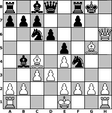 Partie-Notation im PGN-Format [Event "RELAX 2010"] [Site "www.mySchach.de"] [Date "2010.03.22"] [Round "1"] [White "Andylein1989"] [Black "spiderman"] [ECO "C42"] [WhitemyELO "1503"] [BlackmyELO "1524"] [Result "1-0"] [TimeControl "10/3456000"] [WhiteDays "36"] [BlackDays "66"] [MySchachNr "64232"] 1. e4 e5 2. Nf3 Nf6 3. Nc3 Nc6 4. Bc4 Bc5 5. d3 O-O 6. Bg5 h6 7. Bh4 d6 8. Nd5 g5 9. Nxg5 Nxd5 10. Qh5 hxg5 11. Bxg5 Nf4 12. Qh6 Bb4+ 13. c3 1-0 Stellungs-Notation im FEN-Format r1bq1rk1/ppp2p2/2np3Q/4p1B1/1bB1Pn2/2PP4/PP2PPPP/R3K2R - KQ - 0 13 Geschlagene Figuren Weiss: Geschlagene Figuren Schwarz: Klicken Sie auf eine geschlagene Figur um den gewünschten Zug darzustellen!