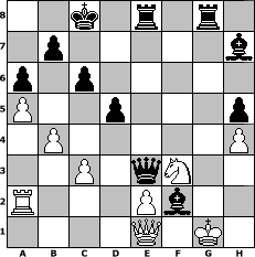 Partie-Notation im PGN-Format [Event "?"] [Site "www.mySchach.de"] [Date "2025.08.18"] [Round "?"] [White "faustballer"] [Black "Winston"] [Variant "Fischerrandom"] [SetUp "1"] [FEN "rbnnqkbr/pppppppp/8/8/8/8/PPPPPPPP/RBNNQKBR w KQkq - 0 1"] [WhitemyELO "1469"] [BlackmyELO "1496"] [Result "0-1"] [TimeControl "10/2592000"] [WhiteDays "115"] [BlackDays "089"] [MySchachNr "133605"] 1. f3 d5 2. Bd4 e5 3. Bc5+ Nd6 4. Ne3 c6 5. c3 Ne6 6. Bxd6+ Bxd6 7. Nf5 Bc7 8. Nb3 Qd7 9. Ng3 Bb6 10. Bf5 g6 11. Bxe6 Qxe6 12. Rd1 f5 13. d4 f4 14. dxe5 Qxe5 15. Nd4 fxg3 16. Qxg3 Qe7 17. h4 O-O-O 18. Qe1 h5 19. Nc2 Bh7 20. Nd4 Rde8 21. Rd2 Rhg8 22. a4 g5 23. b4 g4 24. a5 Bc7 25. Ra2 a6 26. O-O Qe3+ 27. Rf2 gxf3 28. g3 Bxg3 29. Nxf3 Bxf2+ 0-1 Stellungs-Notation im FEN-Format 2k1r1r1/1p5b/p1p5/P2p3p/1P5P/2P1qN2/R3Pb2/4Q1K1 - - - 0 30 Geschlagene Figuren Weiss: Geschlagene Figuren Schwarz: Klicken Sie auf eine geschlagene Figur um den gewünschten Zug darzustellen!