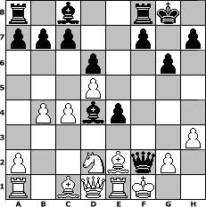 Partie-Notation im PGN-Format [Event "Schneeturnier"] [Site "www.mySchach.de"] [Date "2010.02.08"] [Round "1"] [White "neve"] [Black "Holzhacker"] [ECO "A05"] [WhitemyELO "1384"] [BlackmyELO "2026"] [Result "0-1"] [TimeControl "10/2592000"] [WhiteDays "60"] [BlackDays "56"] [MySchachNr "63067"] 1. Nf3 Nf6 2. d4 g6 3. c4 Bg7 4. Nc3 O-O 5. e4 d6 6. h3 Nbd7 7. Be2 e5 8. d5 Nc5 9. b4 Ncxe4 10. Nxe4 Nxe4 11. Nd2 Nxf2 12. Kxf2 e4 13. Re1 Qh4+ 14. Kg1 Bd4+ 15. Kf1 Qf2# 0-1 Stellungs-Notation im FEN-Format r1b2rk1/ppp2p1p/3p2p1/3P4/1PPbp3/7P/P2NBqP1/R1BQRK2 - - - 6 16 Geschlagene Figuren Weiss: Geschlagene Figuren Schwarz: Klicken Sie auf eine geschlagene Figur um den gewünschten Zug darzustellen!