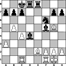 Partie-Notation im PGN-Format [Event "Pedro Damiano"] [Site "www.mySchach.de"] [Date "2016.09.18"] [Round "1"] [White "Naunhofer"] [Black "martinus"] [ECO "C40"] [WhitemyELO "1626"] [BlackmyELO "1767"] [Result "0-1"] [TimeControl "10/2592000"] [WhiteDays "60"] [BlackDays "59"] [MySchachNr "104972"] 1. e4 e5 2. Nf3 f6 3. d4 d5 4. dxe5 Be6 5. exd5 Qxd5 6. Qxd5 Bxd5 7. exf6 Nxf6 8. Be2 Nc6 9. c4 Be4 10. Nc3 O-O-O 11. O-O Bc5 12. Bg5 Rhe8 13. a3 Bf5 14. b4 Bd4 15. Rac1 Bxc3 16. b5 Nd4 17. Nxd4 Bxd4 0-1 Stellungs-Notation im FEN-Format 2krr3/ppp3pp/5n2/1P3bB1/2Pb4/P7/4BPPP/2R2RK1 - - - 0 18 Geschlagene Figuren Weiss: Geschlagene Figuren Schwarz: Klicken Sie auf eine geschlagene Figur um den gewünschten Zug darzustellen!