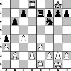 Partie-Notation im PGN-Format [Event "D.A. - Schnell 1"] [Site "www.mySchach.de"] [Date "2008.06.09"] [Round "1"] [White "werderfan"] [Black "Knight"] [ECO "?"] [WhitemyELO "1503"] [BlackmyELO "1230"] [Result "1-0"] [TimeControl "10/864000"] [WhiteDays "10"] [BlackDays "10"] [MySchachNr "45481"] 1. d4 Nf6 2. c4 e6 3. Nc3 d5 4. e3 Bb4 5. a3 Bxc3+ 6. bxc3 dxc4 7. Bxc4 Nc6 8. Nf3 O-O 9. O-O b6 10. Re1 Ne4 11. Bb2 Bb7 12. d5 exd5 13. Bxd5 Re8 14. c4 a5 15. Nd4 a4 16. Nxc6 Bxc6 17. Bxc6 Re7 18. Bxa8 Qxa8 19. Qd5 Qe8 20. Rad1 Nf6 21. Qd8 Qxd8 22. Rxd8+ 1-0 Stellungs-Notation im FEN-Format 3R2k1/2p1rppp/1p3n2/8/p1P5/P3P3/1B1P1PPP/4R1K1 - - - 0 22 Geschlagene Figuren Weiss: Geschlagene Figuren Schwarz: Klicken Sie auf eine geschlagene Figur um den gewünschten Zug darzustellen!