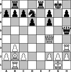 Partie-Notation im PGN-Format [Event " Chess960 im Sommer, Herbst und Winter"] [Site "www.mySchach.de"] [Date "2010.08.04"] [Round "1"] [White "pepo47"] [Black "Chaos"] [Variant "Fischerrandom"] [SetUp "1"] [FEN "nrbkqbrn/pppppppp/8/8/8/8/PPPPPPPP/NRBKQBRN w KQkq - 0 1"] [WhitemyELO "1524"] [BlackmyELO "1687"] [Result "1-0"] [TimeControl "10/3456000"] [WhiteDays "78"] [BlackDays "62"] [MySchachNr "67420"] 1. e4 Nb6 2. Ng3 e5 3. Nb3 d6 4. d4 exd4 5. Nxd4 Ng6 6. Qd2 Be7 7. b3 Bf6 8. Be2 Qe7 9. O-O O-O 10. Nh5 Be5 11. Nf5 Bxf5 12. exf5 Nf4 13. Nxf4 Bxf4 14. f6 gxf6 15. Qxf4 Qxe2 16. Bb2 Nd7 17. Rfe1 Qh5 18. Re3 Rfe8 19. Rh3 1-0 Stellungs-Notation im FEN-Format 1r2r1k1/pppn1p1p/3p1p2/7q/5Q2/1P5R/PBP2PPP/1R4K1 - - - 7 19 Geschlagene Figuren Weiss: Geschlagene Figuren Schwarz: Klicken Sie auf eine geschlagene Figur um den gewünschten Zug darzustellen!