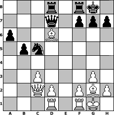 | Partie-Notation im PGN-Format [Event "Katalanisch"] [Site "www.mySchach.de"] [Date "2012.06.11"] [Round "1"] [White "Duschgel"] [Black "lasker"] [ECO "E06"] [WhitemyELO "1564"] [BlackmyELO "1417"] [Result "1-0"] [TimeControl "10/1728000"] [WhiteDays "18"] [BlackDays "19"] [MySchachNr "82148"] 1. d4 Nf6 2. c4 e6 3. g3 d5 4. Bg2 Be7 5. Nf3 O-O 6. O-O dxc4 7. Ne5 c6 8. Nxc4 Nbd7 9. Nc3 Nd5 10. e4 Nxc3 11. bxc3 b5 12. Ne3 Bb7 13. a4 Qc7 14. axb5 cxb5 15. Qb3 a6 16. d5 Nc5 17. Qc2 exd5 18. Nxd5 Bxd5 19. exd5 Qd6 20. Bf4 Qd7 21. d6 Bxd6 22. Rad1 Rad8 23. Bxd6 1-0 Stellungs-Notation im FEN-Format 3r1rk1/3q1ppp/p2B4/1pn5/8/2P3P1/2QP1PBP/3R1RK1 - - - 0 23 Geschlagene Figuren Weiss:                              Geschlagene Figuren Schwarz:                               Klicken Sie auf eine geschlagene Figur um den gewünschten Zug darzustellen!