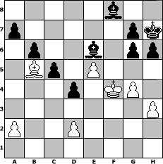 Partie-Notation im PGN-Format [Event "Mal verliert man, mal gewinnen die anderen"] [Site "www.mySchach.de"] [Date "2010.04.17"] [Round "1"] [White "beowulf"] [Black "sprinterde"] [ECO "A40"] [WhitemyELO "1321"] [BlackmyELO "1642"] [Result "0-1"] [TimeControl "10/864000"] [WhiteDays "38"] [BlackDays "39"] [MySchachNr "64900"] 1. d4 e6 2. c4 Nf6 3. Nf3 d5 4. Bg5 Be7 5. e3 h6 6. Bxf6 Bxf6 7. Nc3 dxc4 8. Bxc4 O-O 9. O-O b6 10. e4 Nc6 11. d5 Ne5 12. Nxe5 Bxe5 13. Qh5 Qf6 14. Ne2 Kh7 15. f4 Bxb2 16. e5 Qg6 17. Qxg6+ fxg6 18. Rab1 Ba3 19. Nd4 Bc5 20. Rbd1 Rd8 21. Kh1 exd5 22. Ne6 Bxe6 23. Bd3 Rf8 24. h3 Be3 25. g4 Rxf4 26. Rxf4 Bxf4 27. Rf1 Bg5 28. Kg2 c5 29. Bb5 Be7 30. Kg3 Rf8 31. Rxf8 Bxf8 32. Kf4 d4 0-1 Stellungs-Notation im FEN-Format 5b2/p5pk/1p2b1pp/1Bp1P3/3p1KP1/7P/P2P4/8 - - - 0 33 Geschlagene Figuren Weiss: Geschlagene Figuren Schwarz: Klicken Sie auf eine geschlagene Figur um den gewünschten Zug darzustellen!