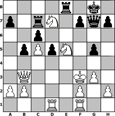 Partie-Notation im PGN-Format [Event "Wanderpokal November 2006 -"] [Site "www.mySchach.de"] [Date "2006.12.01"] [Round "1"] [White "nordlicht"] [Black "YinYang512"] [Variant "Fischerrandom"] [SetUp "1"] [FEN "brnbkrnq/pppppppp/8/8/8/8/PPPPPPPP/BRNBKRNQ w KQkq - 0 1"] [WhitemyELO "1969"] [BlackmyELO "1585"] [Result "1-0"] [TimeControl "10/864000"] [WhiteDays "10"] [BlackDays "09"] [MySchachNr "30654"] 1. b3 b6 2. Nd3 e6 3. e3 Bf6 4. Bf3 Bxa1 5. Rxa1 g6 6. Ke2 d5 7. c4 dxc4 8. bxc4 Nd6 9. Bxa8 Rxa8 10. g3 Rd8 11. c5 Nc4 12. Qc6+ Rd7 13. Nf3 Ne7 14. Qb5 Nxd2 15. Kxd2 c6 16. Qb3 O-O 17. Ke2 b5 18. e4 Qg7 19. Nde5 Rc7 20. Rad1 g5 21. Nd7 Re8 22. Nfe5 Nd5 23. exd5 exd5 24. Kf3 1-0 Stellungs-Notation im FEN-Format 4r1k1/p1rN1pqp/2p5/1pPpN1p1/8/1Q3KP1/PP3P1P/3R1R2 - - - 1 24 Geschlagene Figuren Weiss: Geschlagene Figuren Schwarz: Klicken Sie auf eine geschlagene Figur um den gewünschten Zug darzustellen!