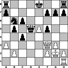 Partie-Notation im PGN-Format [Event "dazwischen"] [Site "www.mySchach.de"] [Date "2010.10.19"] [Round "1"] [White "Caligula"] [Black "Sherlock6834"] [ECO "B12"] [WhitemyELO "1375"] [BlackmyELO "1623"] [Result "0-1"] [TimeControl "10/2592000"] [WhiteDays "88"] [BlackDays "90"] [MySchachNr "69186"] 1. e4 c6 2. d4 d5 3. e5 Bf5 4. Be3 Nd7 5. Nf3 e6 6. c4 Bb4+ 7. Nbd2 dxc4 8. a3 Bxd2+ 9. Qxd2 b5 10. Qc3 Nb6 11. Be2 Ne7 12. Nh4 Ned5 13. Qd2 Nxe3 14. g3 Nc2+ 15. Kf1 Nxa1 16. Nxf5 exf5 17. Kg2 Nb3 18. Qc3 Nxd4 19. Bf3 Nxf3 20. Qxf3 Qd5 0-1 Stellungs-Notation im FEN-Format r3k2r/p4ppp/1np5/1p1qPp2/2p5/P4QP1/1P3PKP/7R - kq - 1 21 Geschlagene Figuren Weiss: ![]() ![]() ![]() ![]() ![]() ![]() ![]() ![]() ![]() ![]() ![]() ![]() ![]() ![]() ![]() Geschlagene Figuren Schwarz: ![]() ![]() ![]() ![]() ![]() ![]() ![]() ![]() ![]() ![]() ![]() ![]() ![]() ![]() ![]() Klicken Sie auf eine geschlagene Figur um den gewünschten Zug darzustellen!