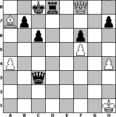 Partie-Notation im PGN-Format [Event "Enkel-Meisterschaft 2017"] [Site "www.mySchach.de"] [Date "2017.09.30"] [Round "1"] [White "Knight"] [Black "Andylein1989"] [ECO "D00"] [WhitemyELO "1156"] [BlackmyELO "1664"] [Result "0-1"] [TimeControl "10/2592000"] [WhiteDays "120"] [BlackDays "116"] [MySchachNr "109803"] 1. d4 d5 2. e4 dxe4 3. Nc3 Nf6 4. f3 Bf5 5. g4 Bg6 6. g5 Nd5 7. Nxe4 c6 8. h4 Bf5 9. Bd3 e6 10. f4 Bxe4 11. Bxe4 Bb4+ 12. c3 Nxc3 13. bxc3 Bxc3+ 14. Bd2 Bxa1 15. Qxa1 Qb6 16. Ne2 Nd7 17. O-O O-O-O 18. Kh1 Qb5 19. Nc3 Qc4 20. Be3 f6 21. gxf6 gxf6 22. f5 e5 23. Rd1 Rhg8 24. dxe5 Nxe5 25. Rxd8+ Rxd8 26. Bxa7 Rd2 27. Qc1 Rd7 28. a4 Nd3 29. Bxd3 Rxd3 30. Qh6 Qxc3 31. Qf8+ Rd8 0-1 Stellungs-Notation im FEN-Format 2kr1Q2/Bp5p/2p2p2/5P2/P6P/2q5/8/7K - - - 2 32 Geschlagene Figuren Weiss: Geschlagene Figuren Schwarz: Klicken Sie auf eine geschlagene Figur um den gewünschten Zug darzustellen!