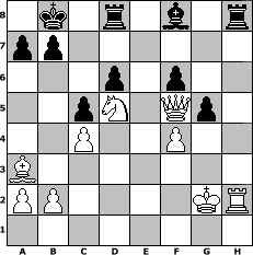 Partie-Notation im PGN-Format [Event "Turnier f"] [Site "www.mySchach.de"] [Date "2008.08.21"] [Round "2"] [White "stierdame1965"] [Black "Knight"] [ECO "C45"] [WhitemyELO "968"] [BlackmyELO "1208"] [Result "1-0"] [TimeControl "10/2592000"] [WhiteDays "098"] [BlackDays "113"] [MySchachNr "47310"] 1. e4 e5 2. Nf3 Nc6 3. d4 exd4 4. Nxd4 Nf6 5. e5 Nxe5 6. f4 Neg4 7. h3 Qe7+ 8. Be2 Ne3 9. Qd3 Nxg2+ 10. Kf1 Nh4 11. c4 Ne4 12. Bf3 Ng3+ 13. Kf2 Nxh1+ 14. Bxh1 d6 15. Nf3 Bxh3 16. Nd4 Bg4 17. Kg3 h5 18. Nf3 Nxf3 19. Bxf3 Qe1+ 20. Kg2 O-O-O 21. Bd2 Bxf3+ 22. Kxf3 h4 23. Bxe1 h3 24. Bb4 h2 25. Qf5+ Kb8 26. Nc3 f6 27. Kg2 Be7 28. Rh1 c5 29. Ba3 g5 30. Nd5 Bf8 31. Rxh2 1-0 Stellungs-Notation im FEN-Format 1k1r1b1r/pp6/3p1p2/2pN1Qp1/2P2P2/B7/PP4KR/8 - - - 0 31 Geschlagene Figuren Weiss: ![]() ![]() ![]() ![]() ![]() ![]() ![]() ![]() ![]() ![]() ![]() ![]() ![]() ![]() ![]() Geschlagene Figuren Schwarz: ![]() ![]() ![]() ![]() ![]() ![]() ![]() ![]() ![]() ![]() ![]() ![]() ![]() ![]() ![]() Klicken Sie auf eine geschlagene Figur um den gewünschten Zug darzustellen!