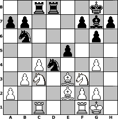 Partie-Notation im PGN-Format [Event "Aljechin - zum F"] [Site "www.mySchach.de"] [Date "2008.10.11"] [Round "1"] [White "Plaidroller"] [Black "Chaos"] [ECO "B02"] [WhitemyELO "1793"] [BlackmyELO "1693"] [Result "1-0"] [TimeControl "10/1728000"] [WhiteDays "36"] [BlackDays "29"] [MySchachNr "48792"] 1. e4 Nf6 2. e5 Nd5 3. Nf3 d6 4. d4 g6 5. c4 Nb6 6. Nc3 Bg7 7. exd6 cxd6 8. Be3 O-O 9. Be2 Nc6 10. O-O Bg4 11. b3 Rc8 12. Rc1 e5 13. dxe5 dxe5 14. Qxd8 Rfxd8 15. h3 Nd4 16. hxg4 1-0 Stellungs-Notation im FEN-Format 2rr2k1/pp3pbp/1n4p1/4p3/2Pn2P1/1PN1BN2/P3BPP1/2R2RK1 - - - 0 16 Geschlagene Figuren Weiss: Geschlagene Figuren Schwarz: Klicken Sie auf eine geschlagene Figur um den gewünschten Zug darzustellen!