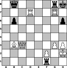 | Partie-Notation im PGN-Format [Event "Bald kommt der Winter"] [Site "www.mySchach.de"] [Date "2013.10.31"] [Round "2"] [White "Schefsche"] [Black "faustballer"] [ECO "C22"] [WhitemyELO "1455"] [BlackmyELO "1504"] [Result "1-0"] [TimeControl "10/2592000"] [WhiteDays "120"] [BlackDays "150"] [MySchachNr "90860"] 1. e4 e5 2. d4 exd4 3. Qxd4 Nc6 4. Qd1 h6 5. Nf3 Nf6 6. Bc4 Bc5 7. Nc3 a6 8. O-O O-O 9. a3 d6 10. Bd5 Ne7 11. b4 Ba7 12. a4 c6 13. Bb3 Bg4 14. h3 Bh5 15. Qd3 Bg6 16. b5 axb5 17. Be3 Bxe3 18. Qxe3 b4 19. Ne2 Bxe4 20. Rad1 Bxf3 21. Qxf3 b6 22. Rfe1 d5 23. Qf4 c5 24. c3 Ng6 25. Qf5 Ne7 26. Qf3 c4 27. Bxc4 Rxa4 28. Bb3 Ra3 29. Nd4 bxc3 30. Qxc3 Qd7 31. Qb4 Ra6 32. Rxe7 Qc8 33. Nb5 Qd8 34. Nc7 Ra7 35. Nxd5 Nxd5 36. Rxd5 Ra1+ 37. Kh2 Qb8+ 38. g3 Rb1 39. Rdd7 Kh8 40. Qc3 Rf1 41. Rxf7 Rg8 42. Rxg7 1-0 Stellungs-Notation im FEN-Format 1q4rk/3R2R1/1p5p/8/8/1BQ3PP/5P1K/5r2 - - - 0 42 Geschlagene Figuren Weiss:                              Geschlagene Figuren Schwarz:                               Klicken Sie auf eine geschlagene Figur um den gewünschten Zug darzustellen!