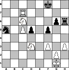 Partie-Notation im PGN-Format [Event "^^Frohes neues Jahr^^"] [Site "www.mySchach.de"] [Date "2007.12.29"] [Round "1"] [White "freizeitspieler"] [Black "Andylein1989"] [ECO "D06"] [WhitemyELO "1570"] [BlackmyELO "1412"] [Result "1-0"] [TimeControl "10/864000"] [WhiteDays "49"] [BlackDays "48"] [MySchachNr "41105"] 1. d4 d5 2. c4 Nf6 3. Nc3 c6 4. Bg5 e6 5. a3 h6 6. Bh4 Be7 7. c5 b6 8. b4 a5 9. e3 Nbd7 10. Nf3 axb4 11. axb4 Bb7 12. Bd3 bxc5 13. bxc5 O-O 14. O-O Ng4 15. Bxe7 Qxe7 16. Qb3 Rab8 17. Qd1 e5 18. Nd2 exd4 19. exd4 Qh4 20. h3 Ngf6 21. Nf3 Qf4 22. Re1 Rfe8 23. Rxe8+ Rxe8 24. Ra7 Qb8 25. Qa1 Nh5 26. Bf5 Ndf6 27. Ne5 g6 28. Bd3 Nf4 29. Ra4 Nxd3 30. Nxd3 Ne4 31. Nd1 Nd2 32. Qc1 Nc4 33. Qxh6 Re4 34. f3 Rxd4 35. N1f2 Qg3 36. Ra7 Rh4 37. Qc1 Qb8 38. Ra2 Bc8 39. Qa1 Qc7 40. Ra8 Kf8 41. Qa6 Kg7 42. Qxc8 Qxc8 43. Rxc8 Na5 44. Ng4 f5 45. Rc7+ Kf8 46. Nge5 Rh6 47. Nxc6 1-0 Stellungs-Notation im FEN-Format 5k2/2R5/2N3pr/n1Pp1p2/8/3N1P1P/6P1/6K1 - - - 0 47 Geschlagene Figuren Weiss: Geschlagene Figuren Schwarz: Klicken Sie auf eine geschlagene Figur um den gewünschten Zug darzustellen!